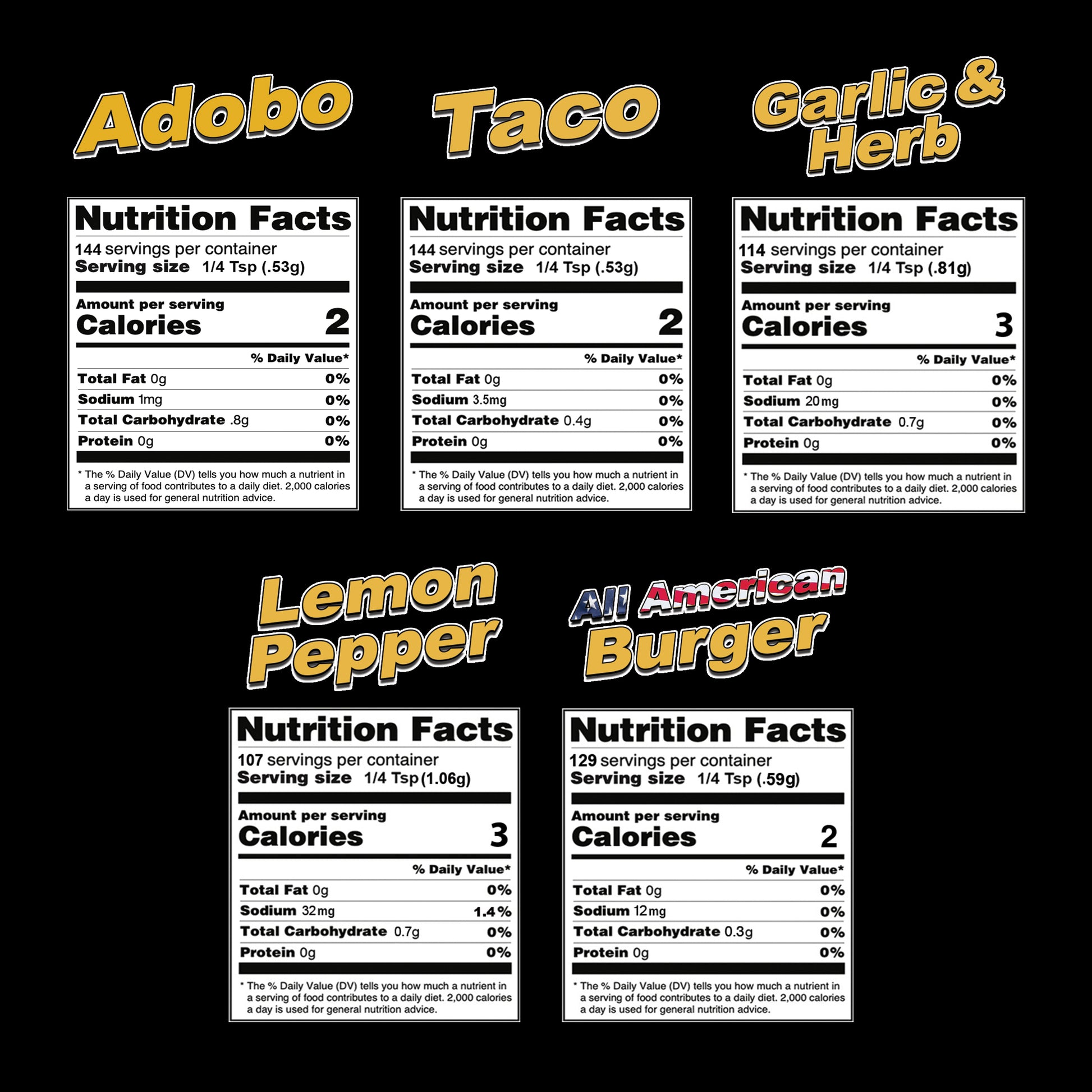 Lauri Lee's FAB 5! Ultra Low Sodium Seasoning Blend Combo Pack - Adobo, Taco, Garlic & Herb, Lemon Pepper, All American Burger - Made In USA - Bold, All Natural Seasoning Flavors for Virtually All Foods, Without All The Salt
